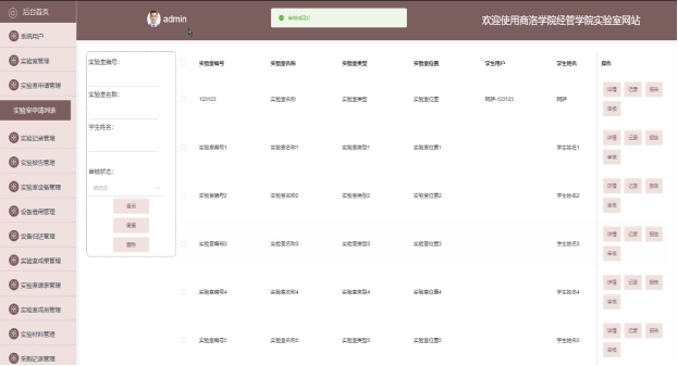 - 系统用户管理:管理员可以对系统内的不同用户类型进行管理,包括但不限于管理员、学生用户、实验室人员和教师用户。管理员可以执行添加、删除和查询操作,并且可以查看每个用户的详细信息。