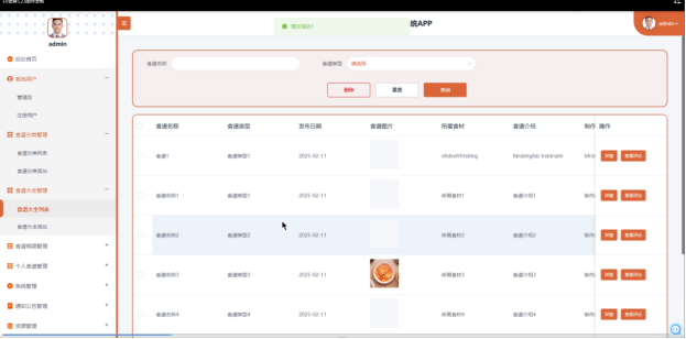 - 食谱大全管理:管理员在食谱大全管理中,可以执行查询、重置、删除、添加食谱的操作,同时查看每条食谱的详细信息和用户评论,以优化食谱内容和提升用户体验。