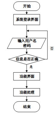 用户首先进入系统登录界面,输入用户名和密码后,系统验证信息是否正确。若验证失败,返回登录界面重新输入,若验证成功,则进入功能界面,执行相应功能处理后结束操作流程。操作流程如下图所示。