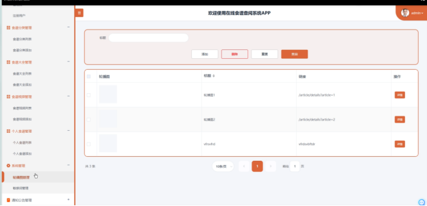 - 资源管理:管理员在资源管理中,能够管理美食资讯和资讯分类,包括查询、重置、删除、添加资讯和分类,同时查看资讯详情和用户评论,丰富平台内容,提高用户粘性。