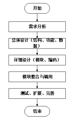 系统开发流程的主要步骤,从需求分析到系统完成的全过程。流程包括需求分析、总体设计(结构、功能、数据)、详细设计(模块、编码)、模块整合与调用,以及测试、扩展和完善,最终完成系统的开发。本系统的开发流程如下图所示