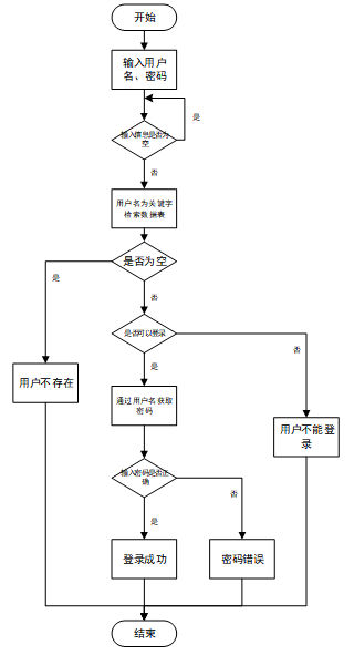 用户输入用户名和密码后,系统先检查输入是否为空,再验证用户名是否存在,若存在则通过用户名获取密码并校验。若密码正确则登录成功,否则提示密码错误。若用户名不存在或无法登录,提示用户操作无效。如下图所示。