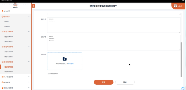 - 食谱视频管理:管理员拥有对食谱视频内容的全面掌控权,包括添加新视频、查询现有视频详情、重置视频信息、删除不再需要的视频,以及查看视频下的用户评论,确保视频内容的丰富性和质量。