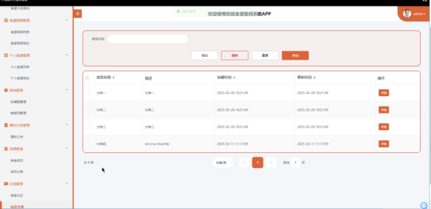- 食谱分类管理:管理员可以灵活调整食谱分类,包括新增分类、查询现有分类详情、重置分类信息、删除不再需要的分类,以及添加或编辑分类下的食谱。