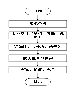 系统开发流程的主要步骤,从需求分析到系统完成的全过程。流程包括需求分析、总体设计(结构、功能、数据)、详细设计(模块、编码)、模块整合与调用,以及测试、扩展和完善,最终完成系统的开发。本系统的开发流程如下图所示