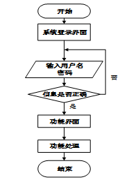 用户首先进入系统登录界面,输入用户名和密码后,系统验证信息是否正确。若验证失败,返回登录界面重新输入,若验证成功,则进入功能界面,执行相应功能处理后结束操作流程。操作流程如下图所示。