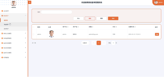 - 系统用户管理:管理员可以在此模块中添加新的用户,包括管理员、学生用户和教师用户。同时,管理员也可以对现有用户进行删除和查询操作,以及查看用户的详细信息。