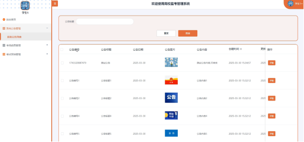 - 系统公告管理:学生用户可以在系统公告管理模块中查看最新的公告信息。通过查询功能,用户可以筛选出自己感兴趣的公告内容,点击任何一条公告的详情链接,可以查看该公告的详细内容和相关说明。