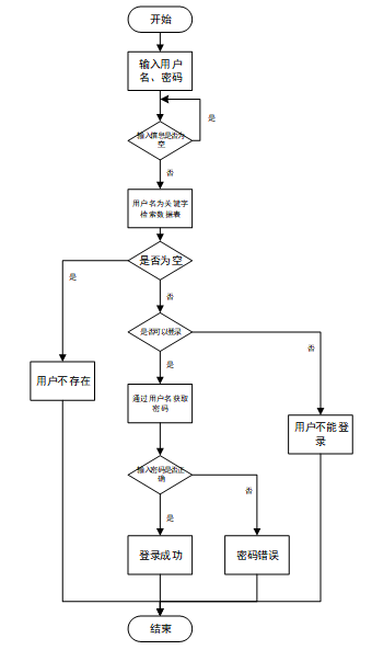 用户输入用户名和密码后,系统先检查输入是否为空,再验证用户名是否存在,若存在则通过用户名获取密码并校验。若密码正确则登录成功,否则提示密码错误。若用户名不存在或无法登录,提示用户操作无效。如下图所示。
