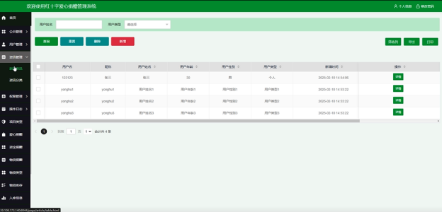 - 用户管理:用户管理分为管理员和捐赠用户两部分。管理员部分包括昵称搜索、查询、重置、删除、新增、筛选列、导出、打印、详情查看等功能;捐赠用户部分包括用户姓名搜索、用户类型下拉选择、查询、重置、删除、新增、筛选列、导出、打印、详情查看等功能。这些功能确保管理员能够有效管理不同类型的用户账户,包括对用户信息的更新、查询和删除等操作。