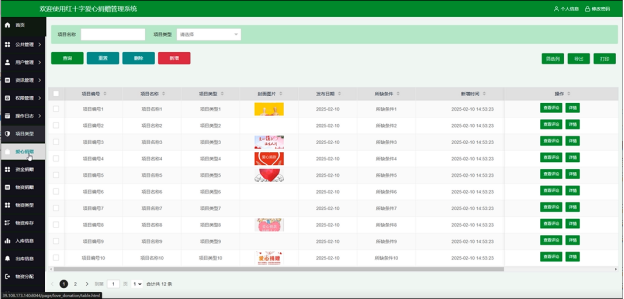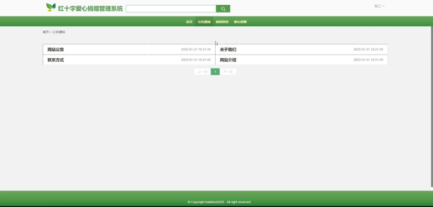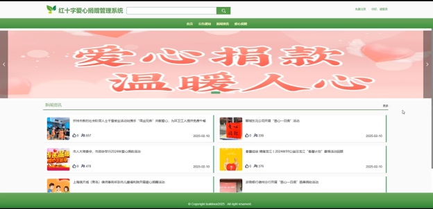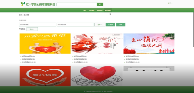 The Red Cross Love Donation Management System developed based on the springboot framework aims to enhance the transparency, efficiency, and user experience of the donation process, thereby better serving the public welfare cause. The system utilizes modern information technology to integrate online and offline resources, building an efficient and convenient interactive platform for donors and beneficiaries. Through this platform, donors can easily view project details, choose donation methods, and track the use of donation funds in real-time; beneficiaries can also apply for assistance and support more conveniently.
