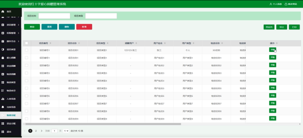 - 物资分配:物资分配的管理包括项目名称搜索、项目类型搜索、查询、重置、删除、新增、筛选列、导出、打印、详情查看等功能。这些功能帮助管理员高效地进行物资分配工作,确保物资能够及时准确地送达需要帮助的人手中。