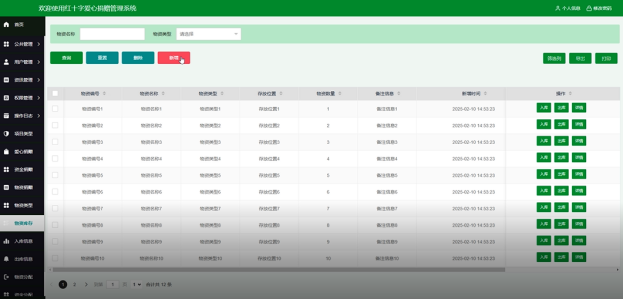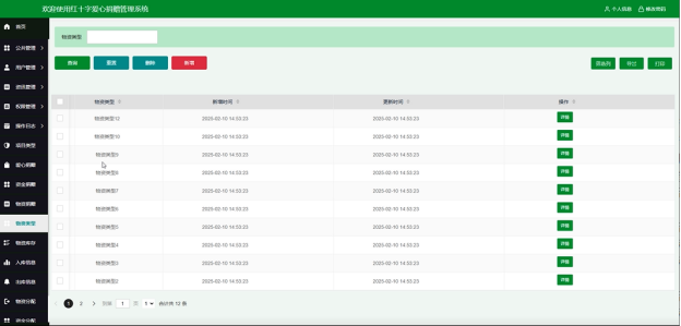 - 物资类型:物资类型的管理包括物资类型搜索、查询、重置、删除、新增、筛选列、导出、打印、详情查看等功能。这些功能帮助管理员对捐赠物资进行分类和管理,使得物资的存储和分配更加高效有序。