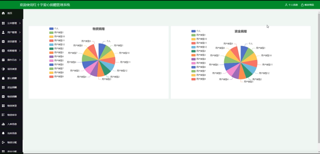 - 后台首页:此页面主要展示统计图表,方便管理员快速了解系统状态。通过直观的图形化数据,管理员可以迅速把握捐赠情况、用户活跃度等关键信息,从而做出相应的管理决策。