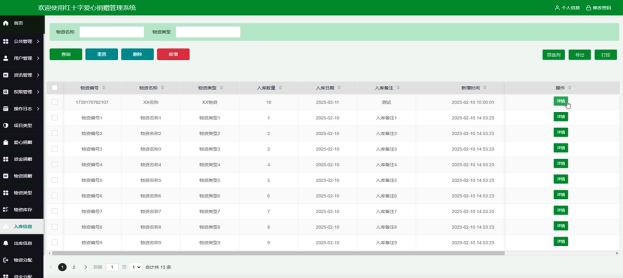 - 入库信息:入库信息的管理包括物资名称搜索、物资类型搜索、查询、重置、删除、新增、筛选列、导出、打印、详情查看等功能。这些功能为管理员提供对物资入库流程的详细监控,确保物资入库的准确性和及时性。
