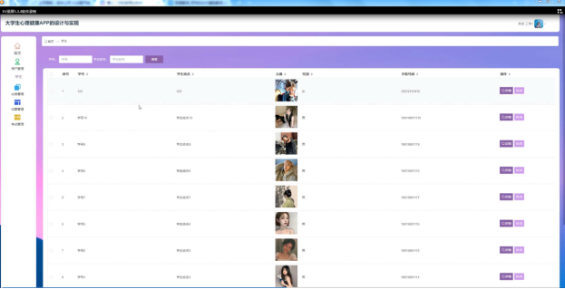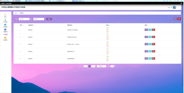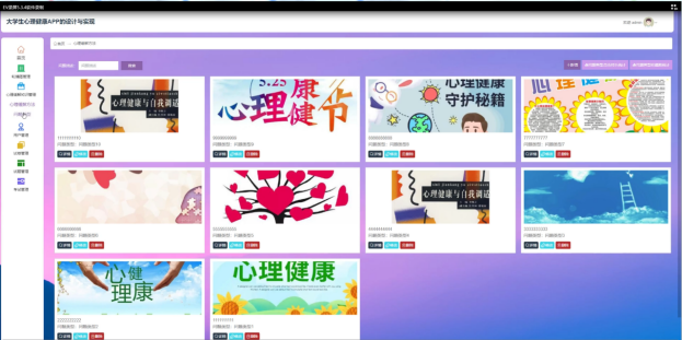 The system integrates functional modules such as test paper management, question management, user management, and psychological knowledge display, meeting the needs of teachers and administrators for content maintenance and data analysis. By using methods such as rotating images, bookmarking mechanisms, and click statistics, we aim to increase user engagement and enhance the platform's interactive experience. The overall design focuses on data security and role permission division, suitable for mental health education scenarios in universities, providing stable and reliable psychological support tools for teachers and students.