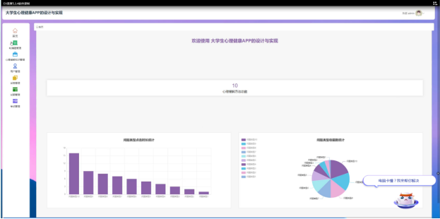 - 首页: 首页展示平台核心数据概览,包括各类问题类型的点击时长统计、收藏数量统计以及心理缓解方法的总数,帮助管理员快速掌握系统的使用情况和内容热度趋势。