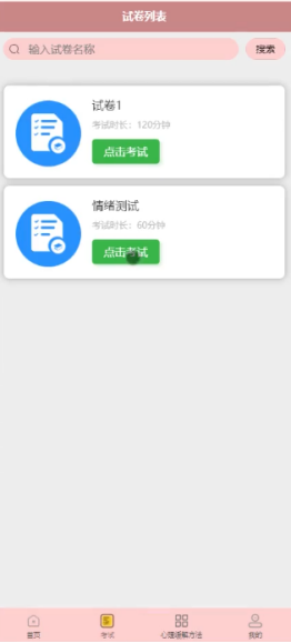 - 考试:在考试功能中,学生可以搜索特定的心理学相关测试或浏览已有的试卷资源进行自我评估。情绪测试帮助学生了解自身的情绪状态,所有测试完成后可以直接在线提交并查看结果反馈。