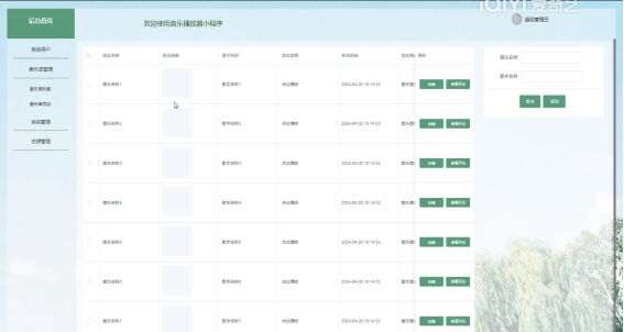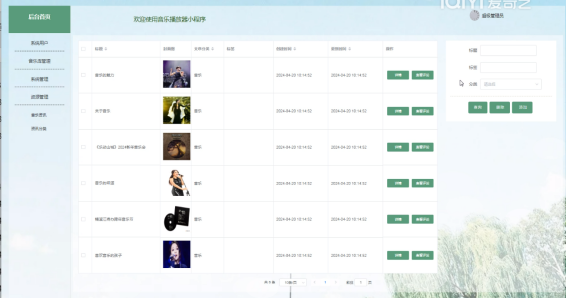 (4)音乐管理:点击“音乐”这个菜单,可以查看到音乐信息,进行查询,添加、删除等操作。