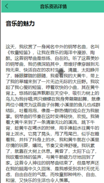 音乐资讯:当用户点击下方导航栏“音乐资讯”这一菜单按钮,会显示管理员在后台发布的所有的音乐资讯,可以查看详情,进行添加点赞、收藏、评论等。界面如下图所示。