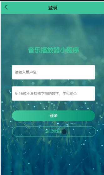 (1)登录:基于微信小程序的音乐播放器小程序前台注册后的用户是可以通过自己的账户名和密码进行登录的,当用户输入完整的自己的账户名和密码后,点击“登录”按钮后,将会首先验证输入的有没有空数据,再次验证输入的账户名+密码和数据库中当前保存的用户信息是否一致,只有在一致后将会登录成功并自动跳转到基于微信小程序的音乐播放器小程序的首页中;否则将会提示相应错误信息。
