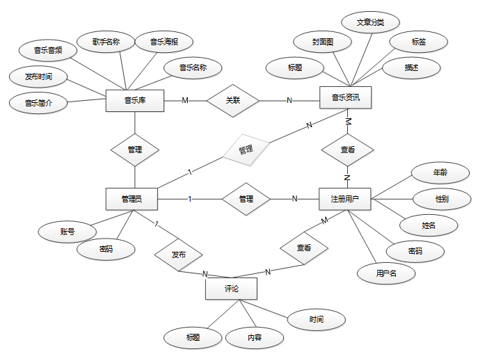 数据库概念结构设计主要涉及数据库的实体和实体之间的关系。通过实体-关系模型或者其他适当的模型,我们将定义系统中涉及的各个实体以及它们之间的联系。下面是整个基于微信小程序的音乐播放器小程序的总E-R关系图。