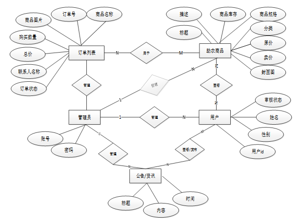 数据库概念结构设计主要涉及数据库的实体和实体之间的关系。通过实体-关系模型或者其他适当的模型,我们将定义系统中涉及的各个实体以及它们之间的联系。下面是整个电商扶贫助农平台小程序的总E-R关系图。