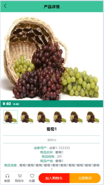 助农商品:当用户点击下方导航栏“助农商品:”这一菜单按钮,会显示管理员在后台发布的所有的助农新闻,可以查看详情,进行添加购物车、购买、收藏、评论等。界面如下图所示。