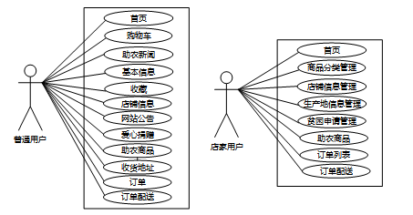 电商扶贫助农平台小程序中普通用户角色/店家用户角色用例图如图2.1所示: