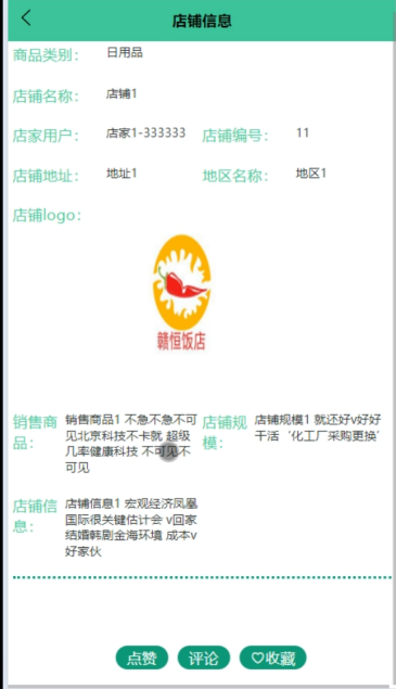 (2)店铺信息:当用户点击下方导航栏“店铺信息”这一菜单按钮,会显示管理员在后台发布的所有的店铺信息,可以查看详情,进行收藏、点赞、评论等。