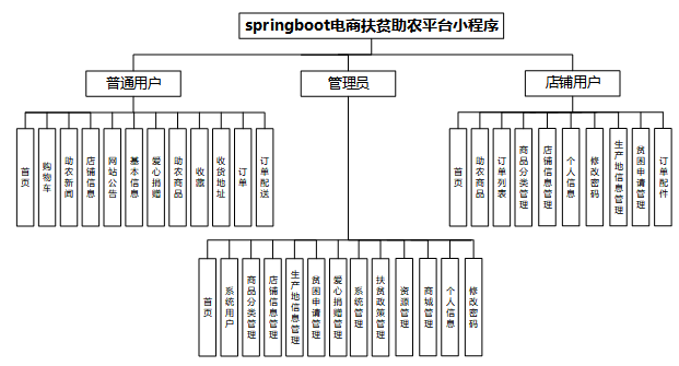 电商扶贫助农平台小程序我划分为了用户管理模块和管理员模块及店家用户模块这三大部分。