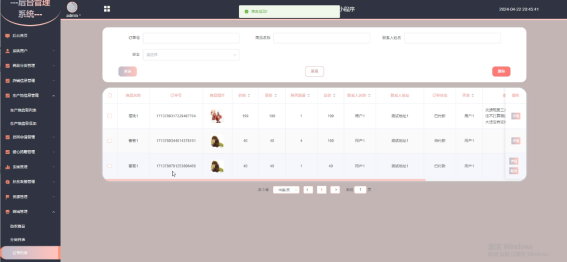 订单列表:可以查看到订单列表详情,进行查询,添加、删除等操作,界面如下图所示。