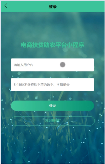 (1)登录:电商扶贫助农平台小程序前台注册后的用户是可以通过自己的账户名和密码进行登录的,当用户输入完整的自己的账户名和密码后,点击“登录”按钮后,将会首先验证输入的有没有空数据,再次验证输入的账户名+密码和数据库中当前保存的用户信息是否一致,只有在一致后将会登录成功并自动跳转到电商扶贫助农平台小程序的首页中;否则将会提示相应错误信息。