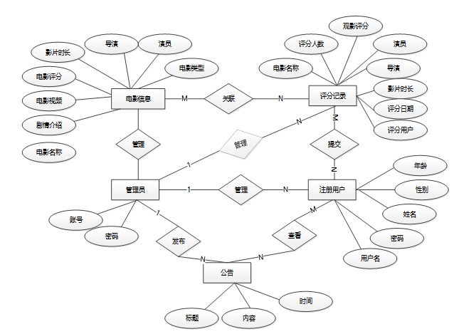 数据库概念结构设计主要涉及数据库的实体和实体之间的关系。通过实体-关系模型或者其他适当的模型,我们将定义系统中涉及的各个实体以及它们之间的联系。下面是整个基于微信小程序的电影推荐系统微信小程序的总E-R关系图。