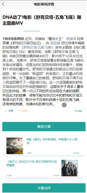 (2)电影资讯:当用户点击下方导航栏“电影资讯”这一菜单按钮,会显示管理员在后台发布的所有的电影资讯信息,可以查看详情,进行收藏、点赞、评论等。