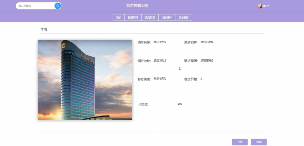 (2)旅游资讯:用户点击“旅游资讯”菜单显示所有的旅游资讯信息,可以按照条件进行旅游资讯的筛选或者输入关键词进行局部搜索,点击可以进入旅游资讯详细展示界面,在此界面用户可以收藏、点赞和评论。