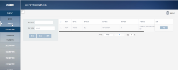 (4)行程规划:管理员点击“行程规划列表”会显示出所有的行程规划,支持输入普通用户或者用户姓名对行程规划进行查询,如果想要添加新的行程规划,点击“行程规划添加”按钮,输入相关信息,点击“提交”按钮就可以添加了,同时可以选择某一条行程规划,点击“删除”进行删除;