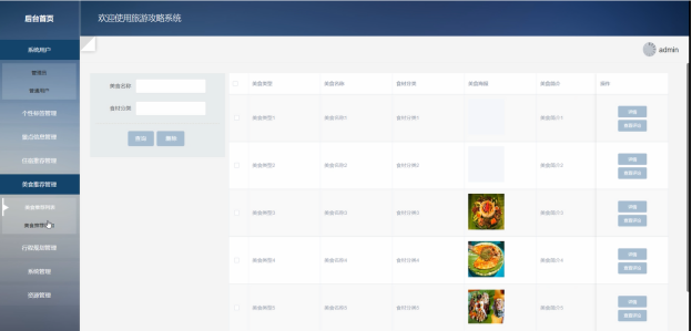 Through this system, administrators are responsible for managing data such as attraction information, accommodation recommendations, and food recommendations, ensuring the accuracy and completeness of the information. Ordinary users can browse scenic spot information according to their own needs and interests, and obtain recommendations for accommodation and food based on personal preferences. The accommodation recommendation module recommends suitable accommodation locations for users based on their budget and preferences, and provides detailed information and evaluations. The food recommendation module recommends local food stores to users based on their taste and preferences, and provides relevant information and user reviews. The itinerary planning module allows users to make itinerary arrangements based on travel time and interests, and provides recommendations for transportation, activities, and attractions, helping users optimize their travel experience.