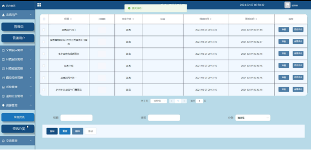 (4)资源管理:进入后台首页工具栏点击“资源管理”这个按钮可以查看所有故宫资讯、资讯分类等信息,可以进行详情查看、删除、查看评论等操作。
