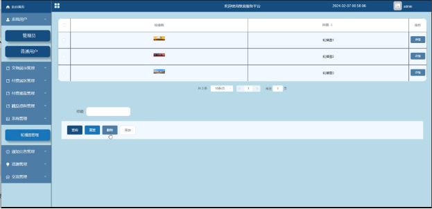 管理员点击“系统管理”这一菜单会显示轮播图菜单,管理员可以对前台展示的轮播图进行设置,轮播图界面如下图4-9所示。
