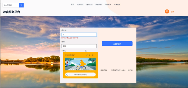故宫服务平台中的注册后的用户是可以通过自己的账户名和密码进行登录的,当用户输入完整的自己的账户名和密码信息并点击“登录”按钮后,将会首先验证输入的有没有空数据,再次验证输入的账户名+密码和数据库中当前保存的用户信息是否一致,只有在一致后将会登录成功并自动跳转到故宫服务平台的首页中;否则将会提示相应错误信息,用户登录界面如下图4-3所示。