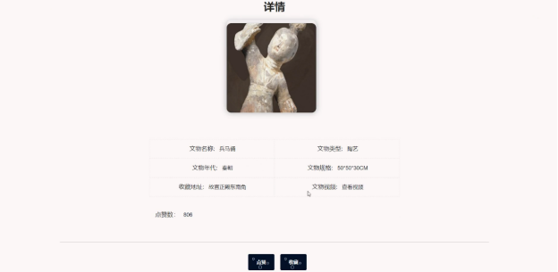(4)文物展示:当用户点击“文物展示”这一菜单按钮,会显示管理员在后台发布的所有的文物展示信息,可以查看详情;可以进行收藏、点赞、评论等;