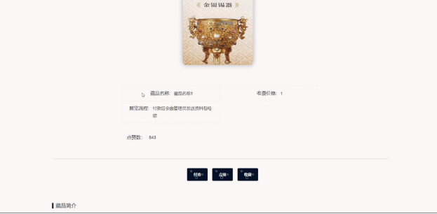 当用户点击“文物展示”后,会进入文物展示列表,点击任意文物展示,可以查看文物展示详情,并可进行点赞、收藏、评论等操作。界面如下图4-4所示。