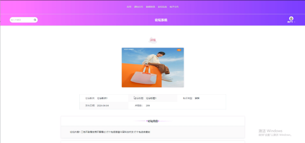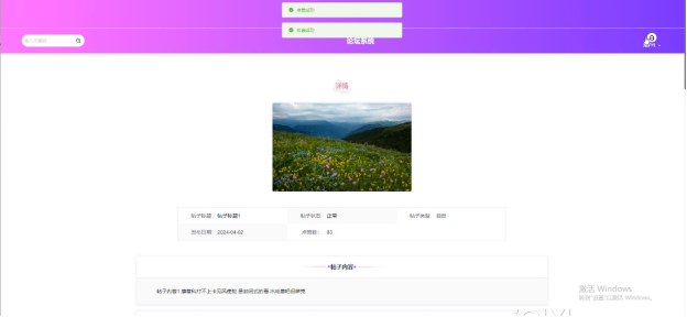当用户点击“帖子公告”这一菜单按钮,会显示管理员在后台发布的所有的帖子公告信息,可以查看详情,进行收藏、点赞、评论等。界面如下图4-4所示。
