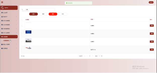 管理员点击“系统管理”这一菜单会显示轮播图菜单,管理员可以对前台展示的轮播图进行设置,轮播图界面如下图4-8所示。