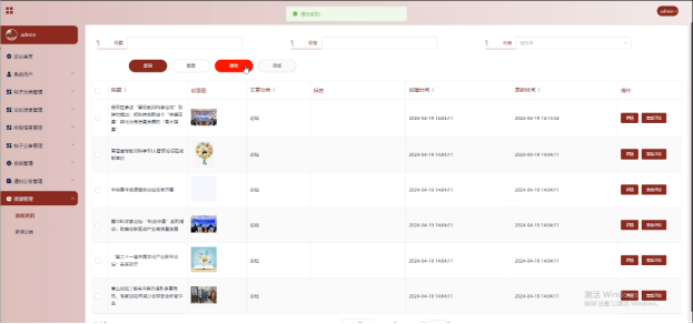 管理员进入后台首页工具栏点击“新闻资讯”这个按钮可以查看所有新闻资讯信息,可以进行详情查看、删除、重置等操作,界面如下图4-8所示。