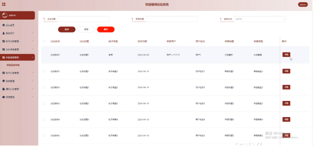 (4)帖子公告管理:进入后台首页工具栏点击“帖子公告管理”这个按钮可以查看所有用户提交的帖子公告,可以进行详情查看、删除、重置等操作。