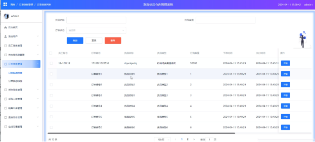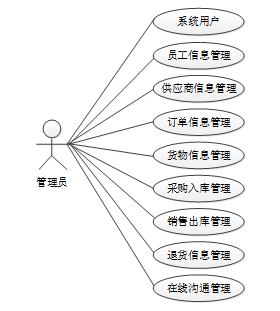 管理员模块提供了登录功能,并可对系统用户进行管理,包括管理员和普通用户。管理员可以管理订单信息,支持查询和添加新的订单信息数据。管理员还可以管理货物信息,同样支持查询和添加新的货物信息数据。管理员还可以对普通用户的订单信息管理、货物信息管理、采购入库管理、销售出库管理、退货信息管理、在线沟通管理等,对其进行审核。此外,管理员还可以管理订单信息和货物信息。具体功能模块包括系统用户(管理员、员工用户、供应商用户)、员工信息管理、供应商信息管理、订单信息管理、货物信息管理、采购入库管理、销售出库管理、退货信息管理、在线沟通管理、个人信息、修改密码管理。