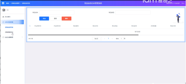 点击左侧菜单“货物信息管理”,页面跳转到货物信息管理外观,调用后台查询所有货物信息。并将信息密封到数据集合List,绑定到请求对象,然后页面跳转到相应的Java页面,显示出货物信息,单击删除按钮完成货物信息的删除。