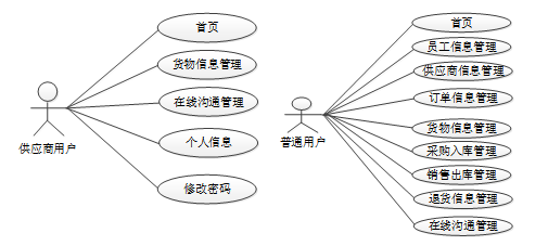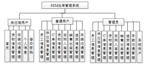 仓库管理系统可以划分为注册普通用户和管理员模块及供应商用户模块三大部分。
